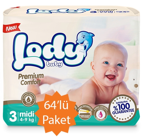 Lody Baby - 3 Numara (Midi) Bebek Bezi - 64'lü Paket (4-9 Kg arası bebekler için)